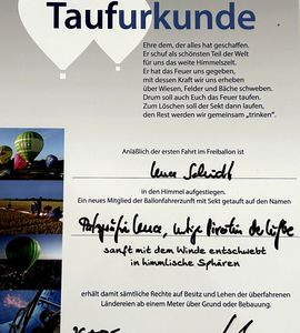 Sanft trug der Wind die Ballone über den Rhein hinweg in Richtung Westerwald. Nach einer sicheren Landung zwischen Hennef und Eitorf stand für die Erstfahrer ein weiteres Highlight auf dem Programm: die feierliche Ballonfahrertaufe. Mit einem Glas Sekt, einer Urkunde und einem adligen Titel wurden die Neulinge in die luftige Gemeinschaft aufgenommen.