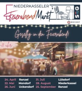 Auch in diesem Jahr lädt die Stadtentwicklungsgesellschaft Niederkassel mbH (SEG) in Zusammenarbeit mit der Eventagentur WEvent UG alle Niederkasselerinnen und Niederkasseler sowie alle interessierten Besucher*innen – ob jung oder alt – zu den Niederkasseler Feierabendmärkten ein.